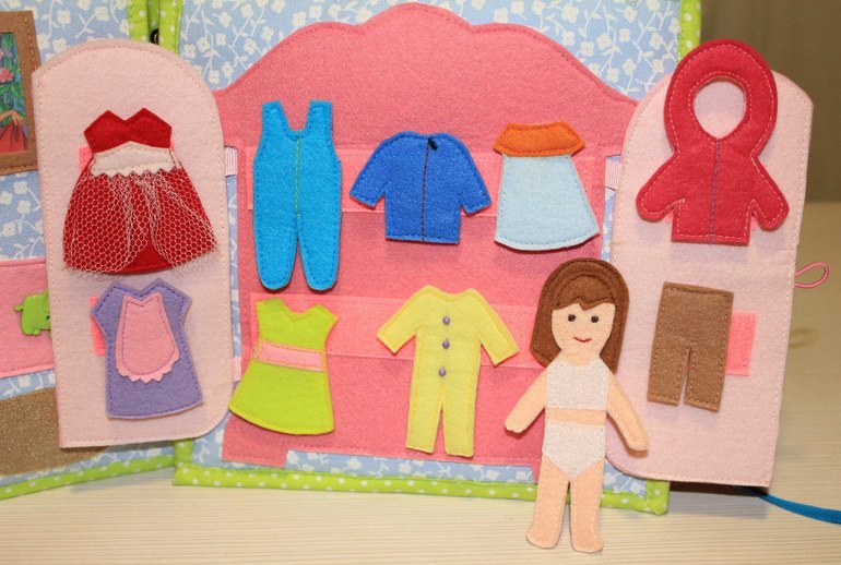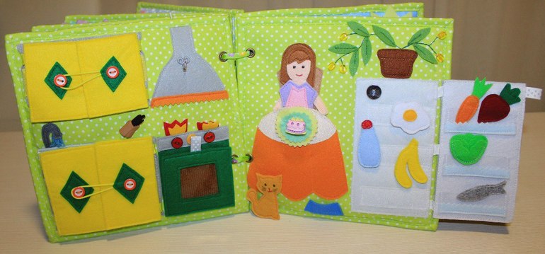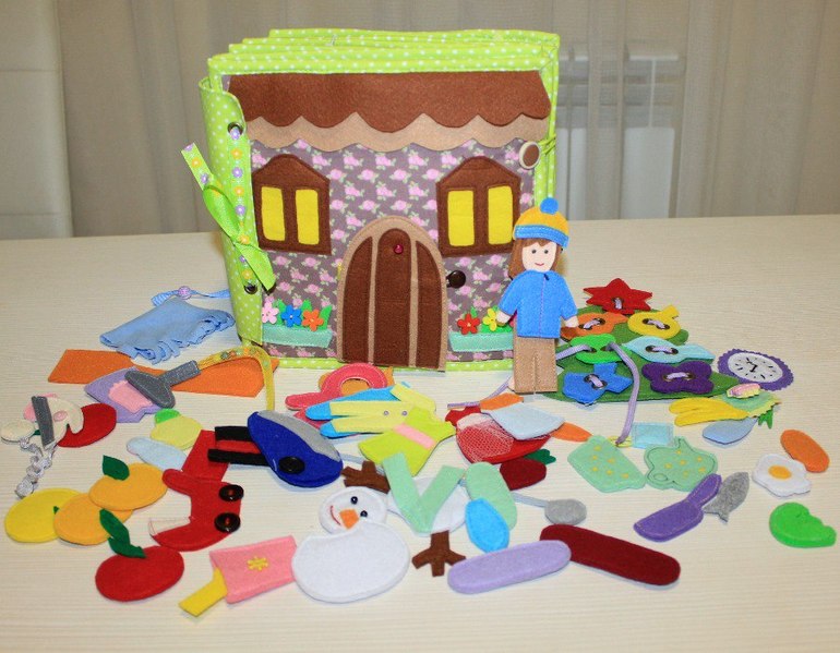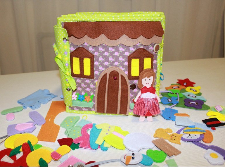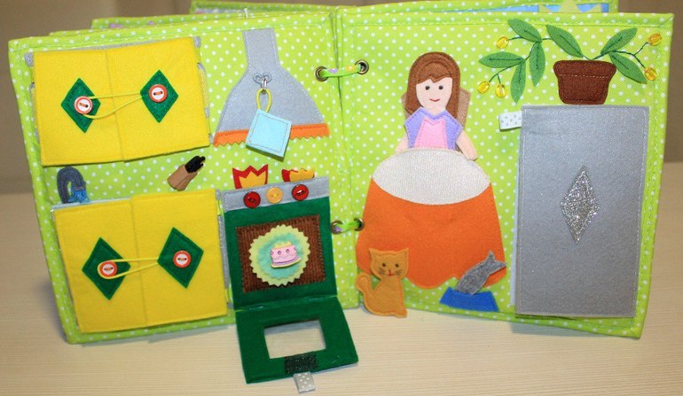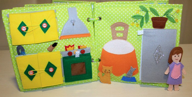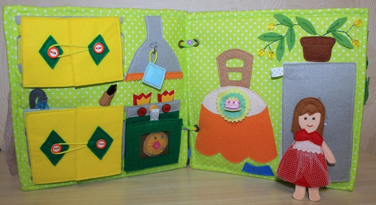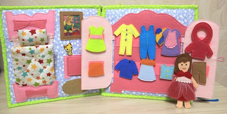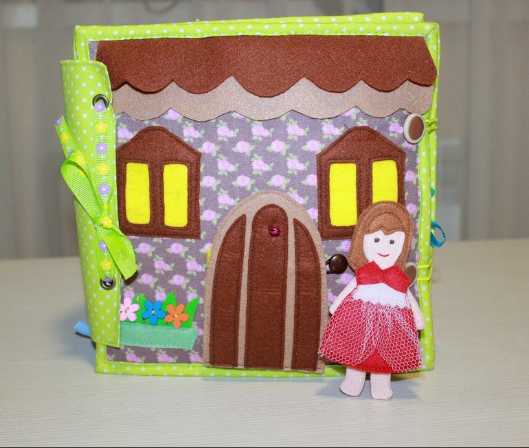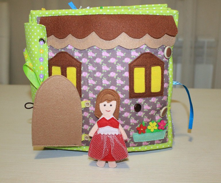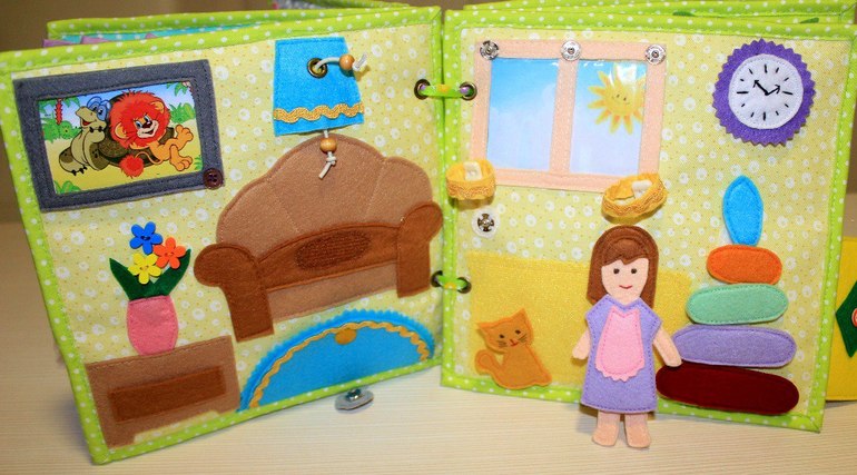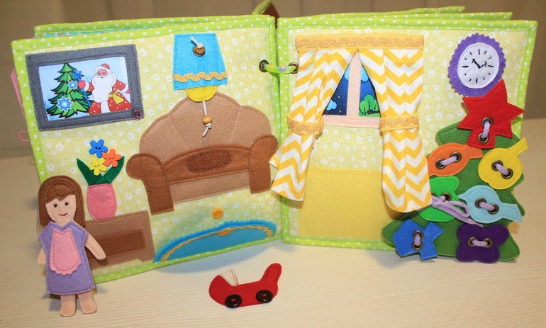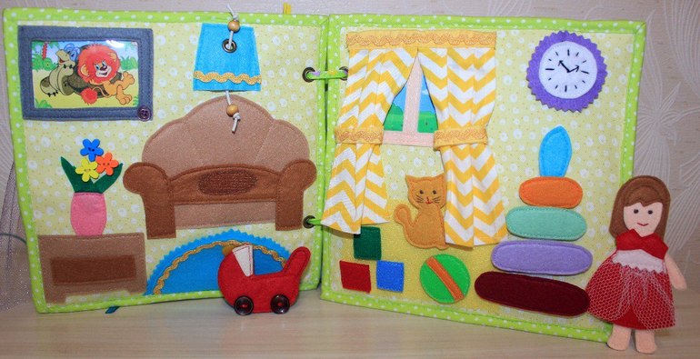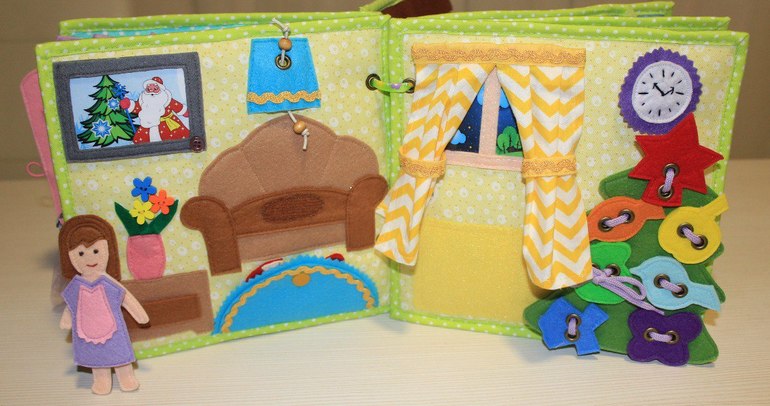На второй странице - окно, со съемными шторами, пейзаж за окном можно менять (зима/ лето; день/ночь); съемные часы на липучке; съемный пазл-пирамидка. На полу липкий коврик из велкроткани, на который можно прикрепить куклу, игрушки или котенка. Вместо пирамиды можно прикрепить елку-шнуровку с игрушками.