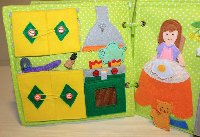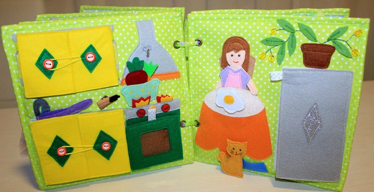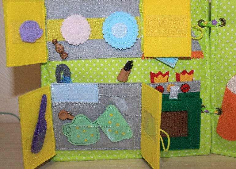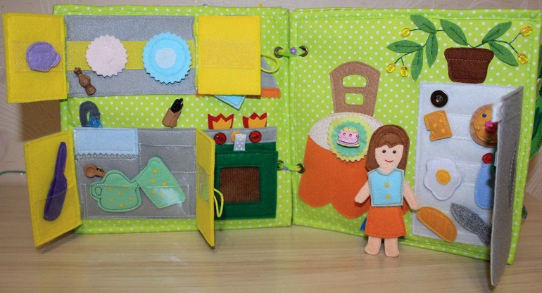 На первой странице - кухонный гарнитур. Все шкафы в кухне открываются, на верху - чашки и тарелки; внизу - кастрюля, чайник и сковорода.