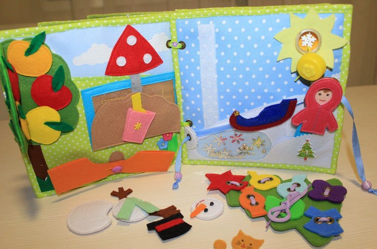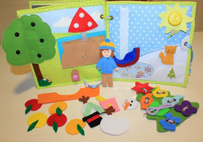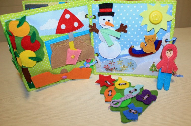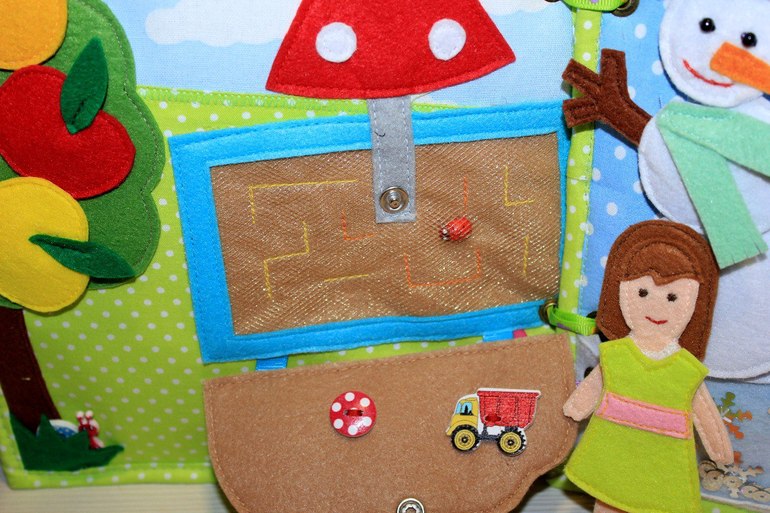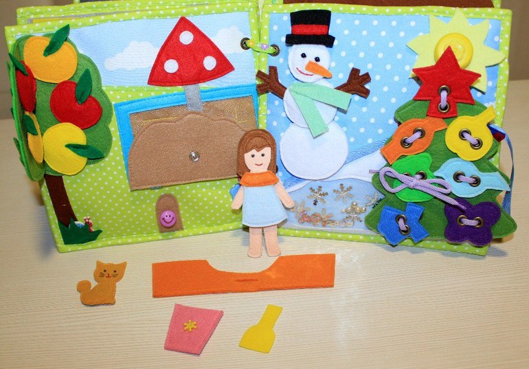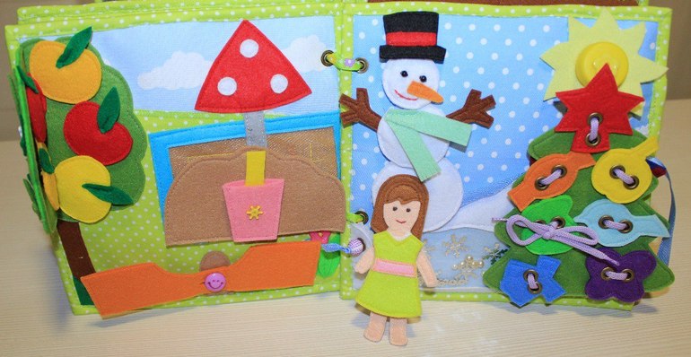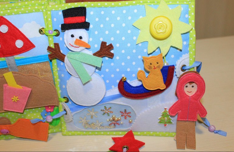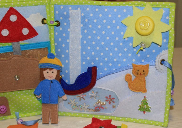 Снеговик состоит из четырех частей, которые с помощью липучки крепятся к странице. В елке и игрушках сделаны отверстия с помощью люверсов, с помощью шнуровки игрушки крепятся на елку. Елка снимается, в канун Нового года елку можно принести в комнату и закрепить на стене с помощью липучки. В горке имеется окошко из пленки, внутри горки бусины и снежинки. Так же в горке есть карман для куклы. К санкам пришита лента-шнурок, потянув за веревочку санки скатываются с горки. По центру санок пришита липучка, к которой крепятся котенок и кукла. Внутри солнца прячется снежинка, крышка на солнце откручивается.