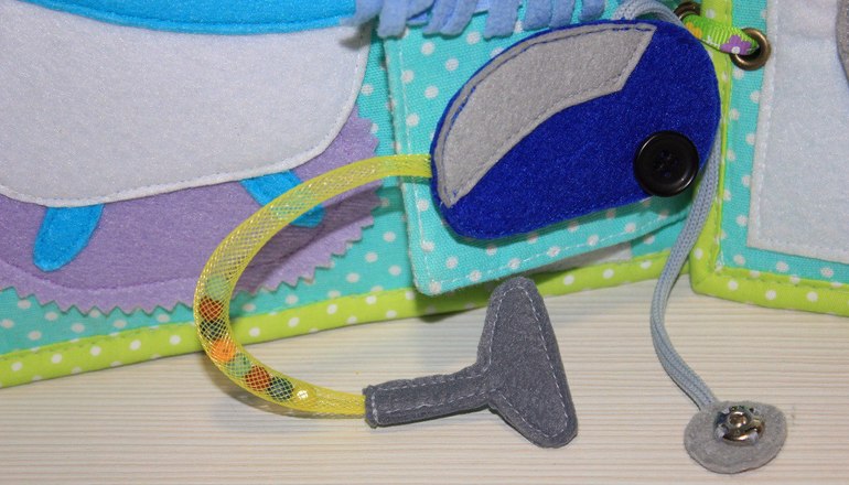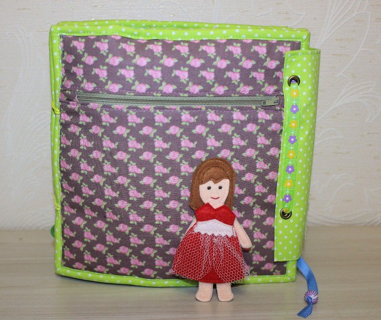Сзади книжки имеется карман на молнии, который можно использовать для хранения съемных деталей. Книжка закрывается на две пуговицы и петельки из шляпной резинки.