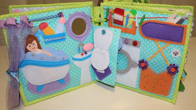Далее дополнительный разворот с унитазом, крышка на унитазе открывается, с обратной стороны разворота весит мягкое полотенце и на липучке крепится пылесос. В трубке пылесоса перемещающиеся бусины.