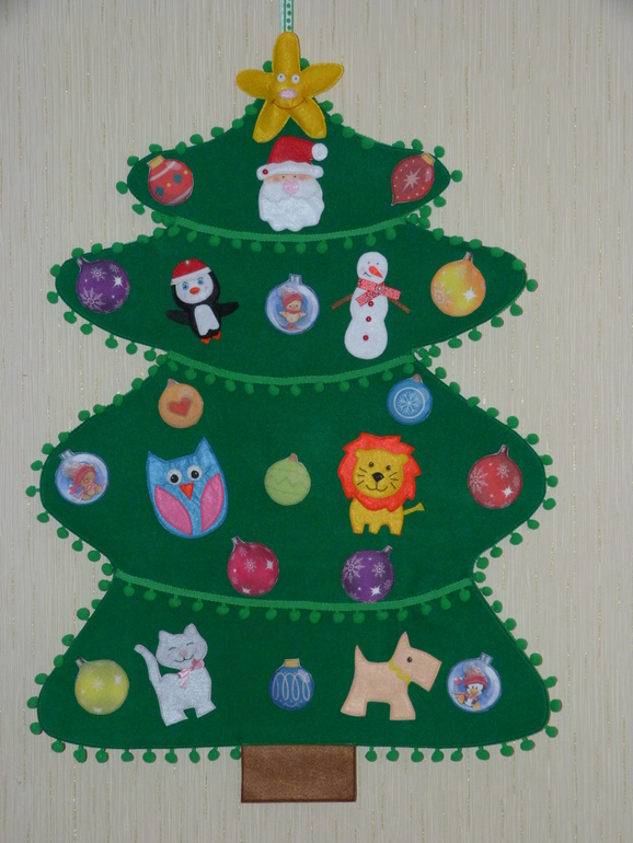 ФетрЯ это сделала !!! А точнее - сшила ёлочку. Высота 70 см. без ствола, ширина 50см. Сшита из фетра и велкроткани, игрушки, а их 23 шт. крепятся на липучках, 8 шт. зверюшек, а остальные - шары, печать на фетре. Под катом много фото, более 5. Извините за качество, никудышный я фотограф !