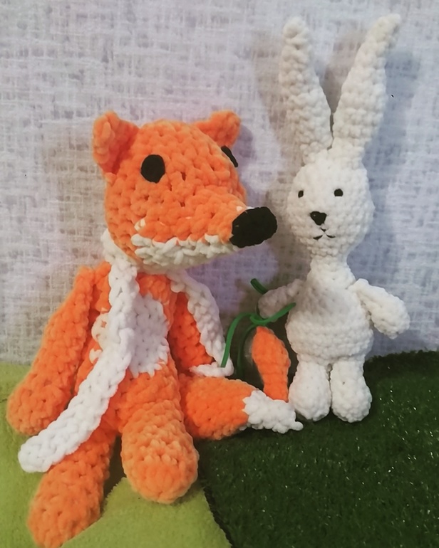 Ну и продолжила плюшевую игрушечную тему. У лисёнка теперь друг зайчик, он конфеты не ест, но лопает вкусную морковку! Ника теперь их по очереди кормит. Спасибо большое за советы по вязанию. Я взяла поменьше крючок и потуже вязала. Зайка не такой дырявый получился