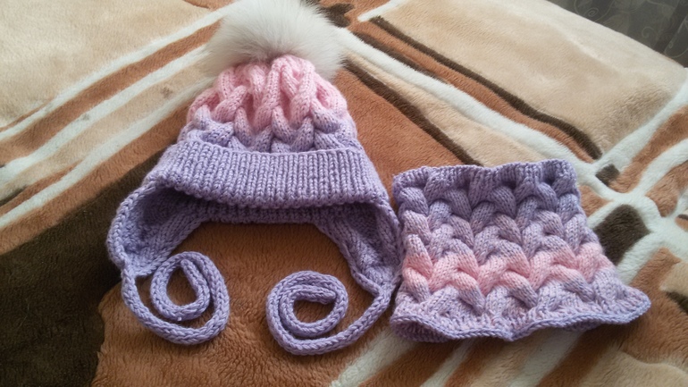 Вязание спицамиЗима не загорами.Связала доче комплект шапочка и снуд.Помпон сделала из песца.очень понравилось мне и вязалось очень легко