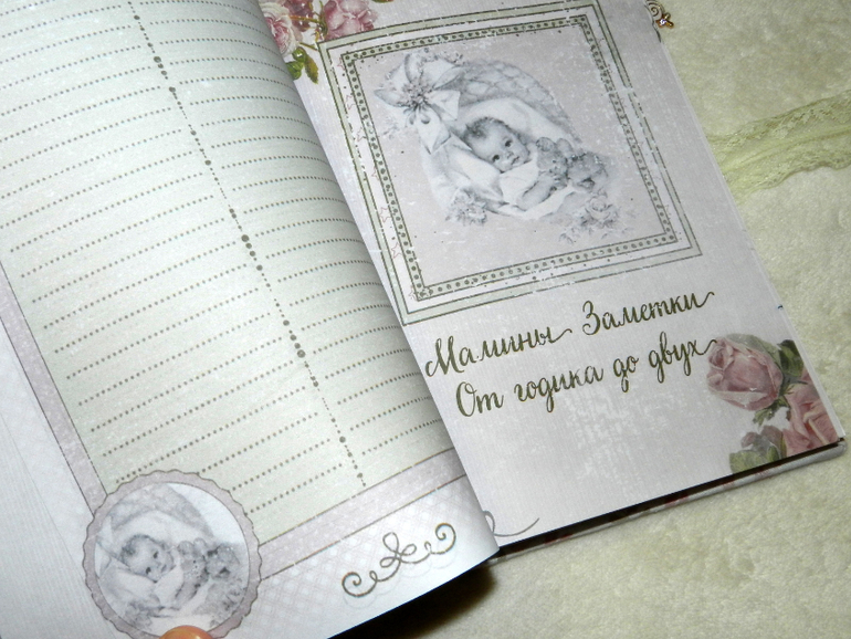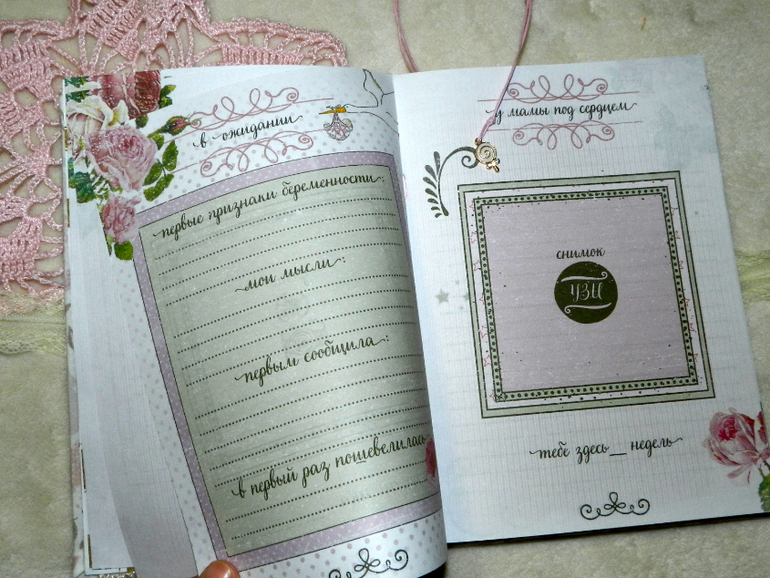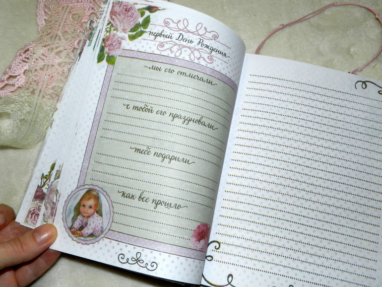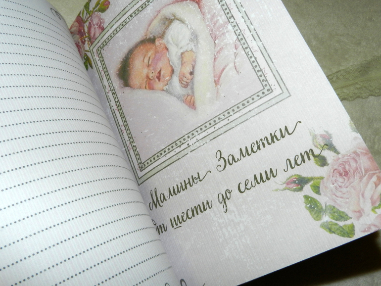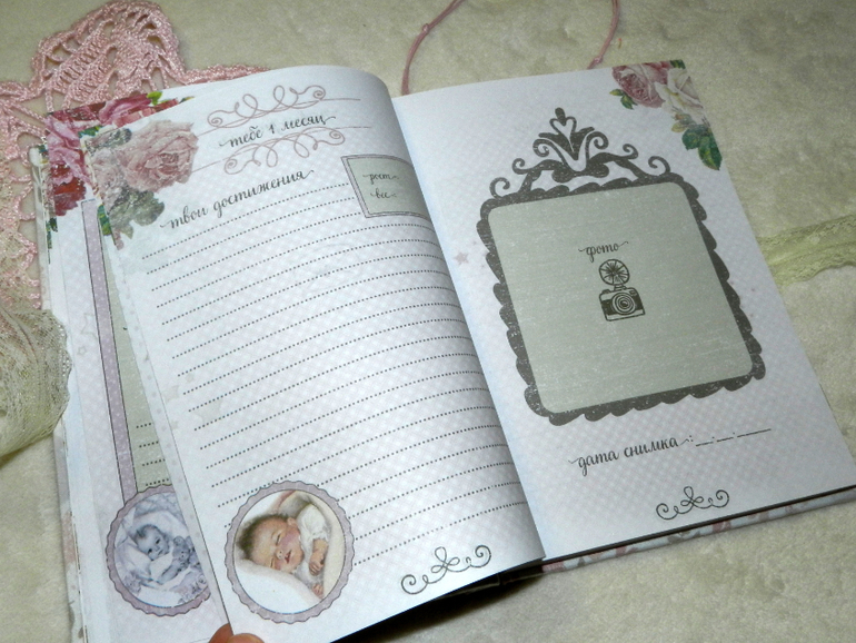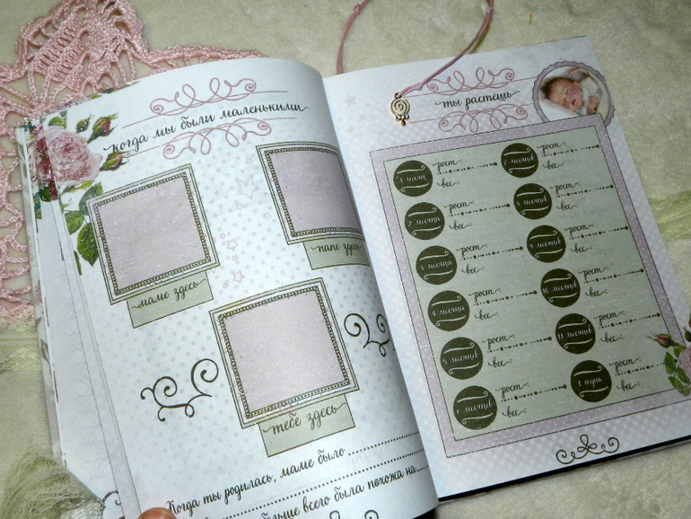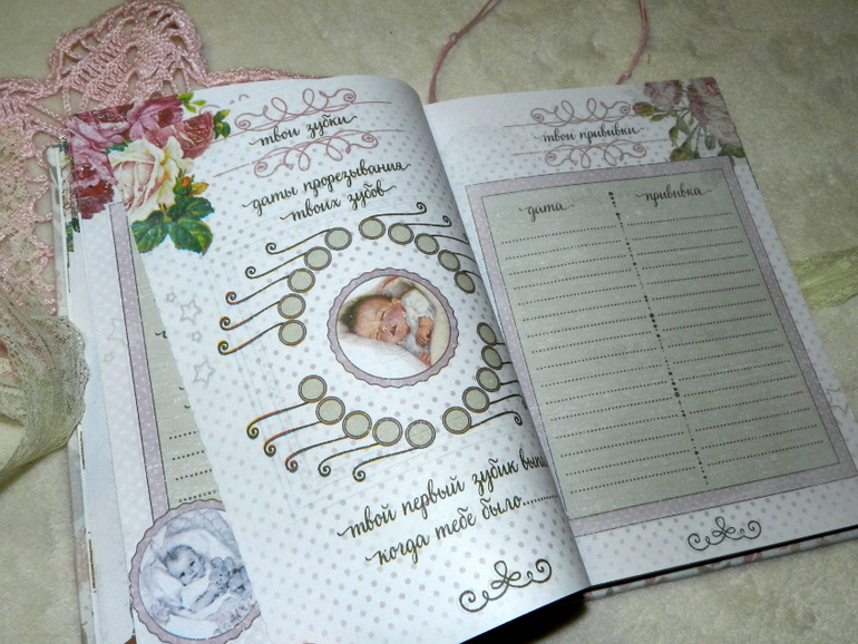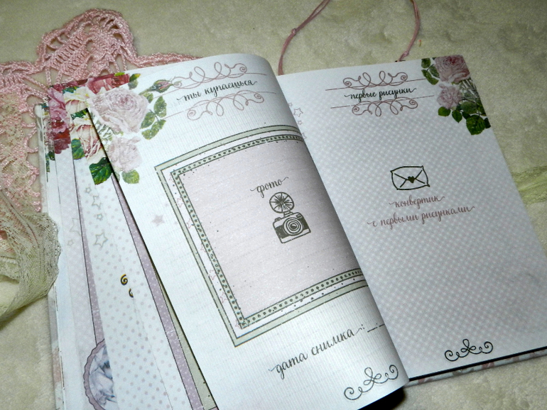 Бебибук для малышки Анастасии. Во вчерашнем посте показывала кусочек) Очень много информативных страничек: от момента Ожидания чуда до 7 лет). Описание каждого месяца до года и от года до 7. Есть место для снимков УЗИ, место для фото (около 30), семейное древо, всяческие графики роста и достижений, анкета.Конвертики для писем или рисуночков, на форзаце 2 милые рамочки, закладочка с подвеской-леденцом. Здесь будут хранится воспоминания! Красиво! бережно!!!