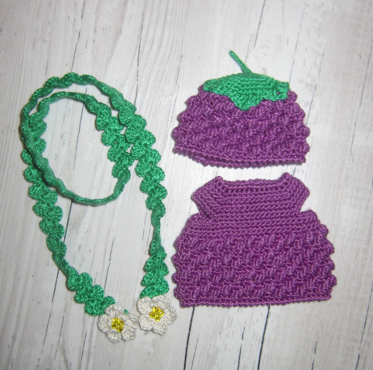 Я связала шарфик, украсила шапочку зелеными листочками и довела до ума платьице для пупса Ежевички.