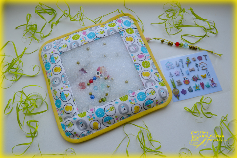Итак, искалочка размером 21х21см - сшита из украинского хлопка - лицевая и задняя часть продублированы тканевым дублирином, по контуру обшита косой бейкой, в центре плёночное окошко 12х12см, чтобы хорошо было видно что искать, а найти нужно 27 предметов :) Наполнитель пластиковый гранулят (ушло почти 350г), а также разные цветные бусины, ну и собственно предметы, которые необходимо найти и проговорить, а возможно и изучить новые!