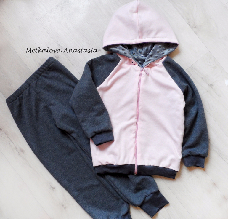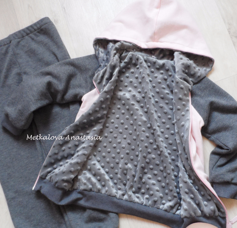 ну и моей дочке перепало :-) сшила ей тепленький костюмчик на прогулку. спешила шила, чтоб осенью поносить, а получилась осень такая - сначала очень жарко, а потом резко очень холодно. Даже выгулять толком не получилось обновку. Серый - футер 3х нитка, персиковый - интерлок, а внутри плюш минки.