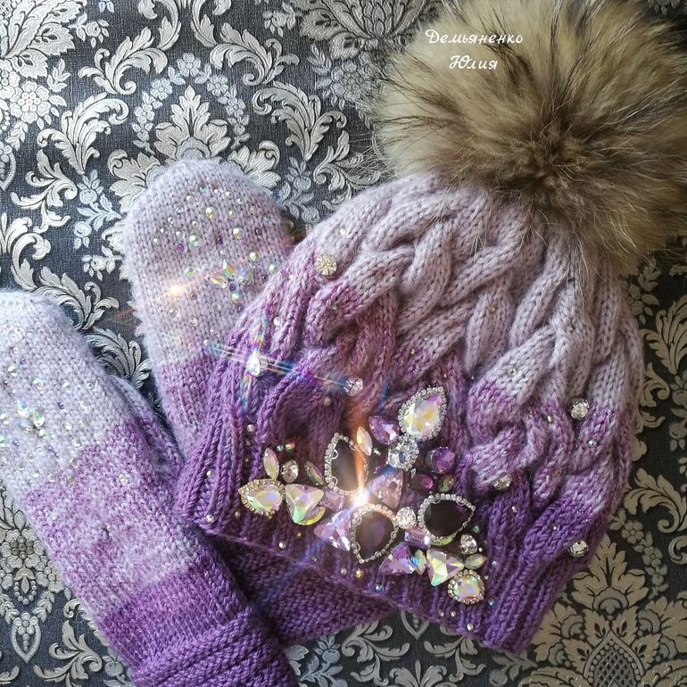 И пару слов о технических моментах: использовала три вида пряжи шерсть, шерсть+пух, полушерсть+люрекс. И варежки и шапка внутри на флисе. Бубон пока этот, но конечный вариант еще под вопросом, возможно, заменю на др, будем решать с заказчицей