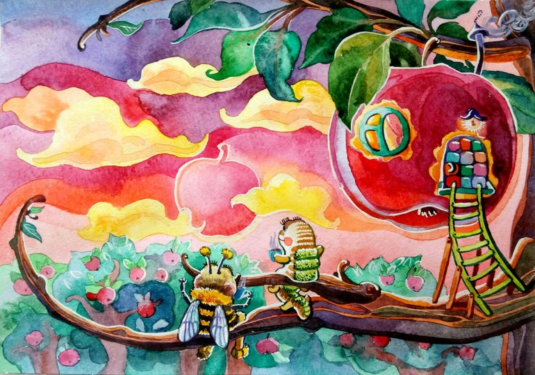 "...С тех пор червячок жил в самом красивом и теплом домике, в котором вкусно пахло яблоками. А по вечерам в гости к нему прилетала пчелка, и они сидели на веточке и смотрели, как укладывается спать солнышко - красное, как яблоко, в котором поселился маленький счастливый червячок..."