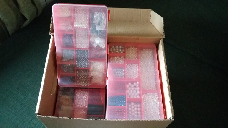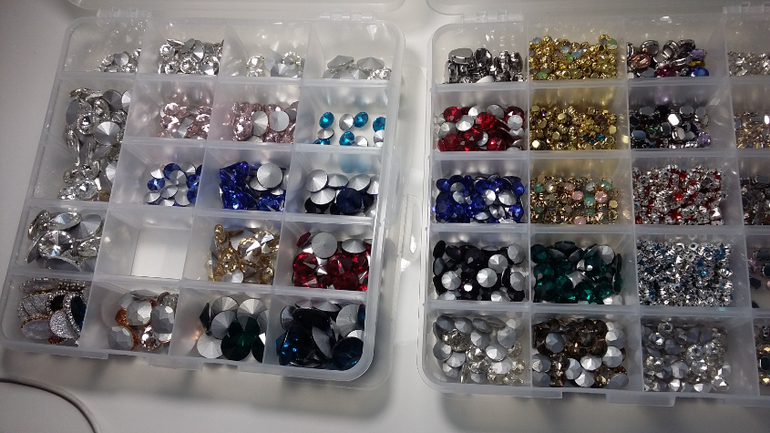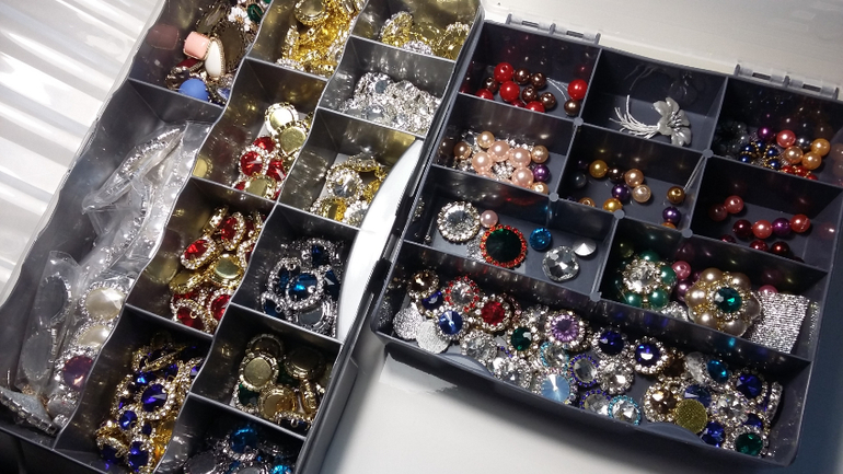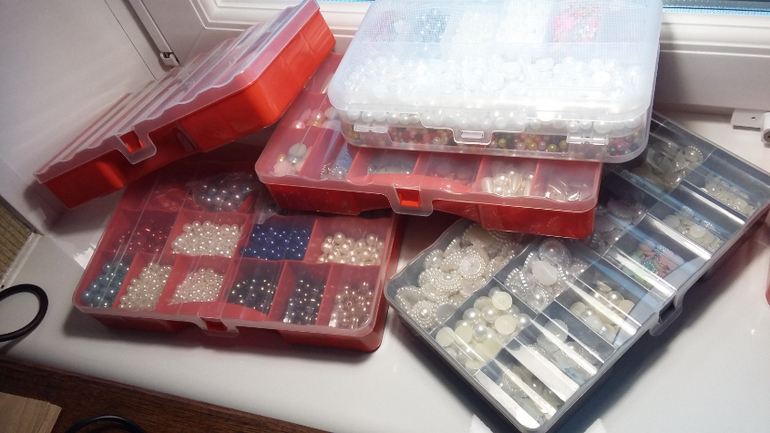 В самом начале не знала, что будут проблемы с хранением подобных готовых серединок. Их положила все в коробоку скопом и потом БАЦ.. и многие из бусин поцарапались о страз ленту. Горе конечно.., но опыт есть опыт!!. Придумала хранить их в самых обычных коробках из под конфет. Они там лежат кажд в отдельности и "не причиняют друг другу вреда" ))) Вот так сейчас у меня хранятся остатки: