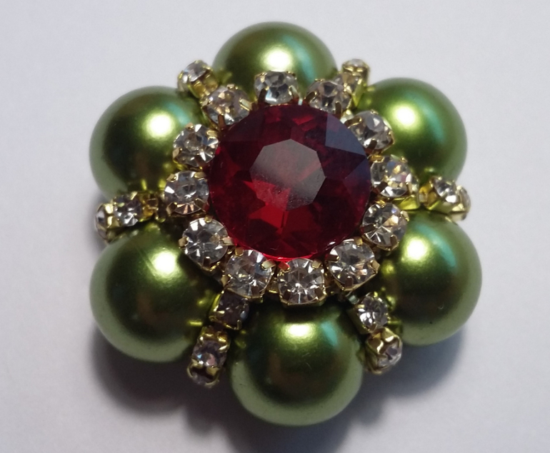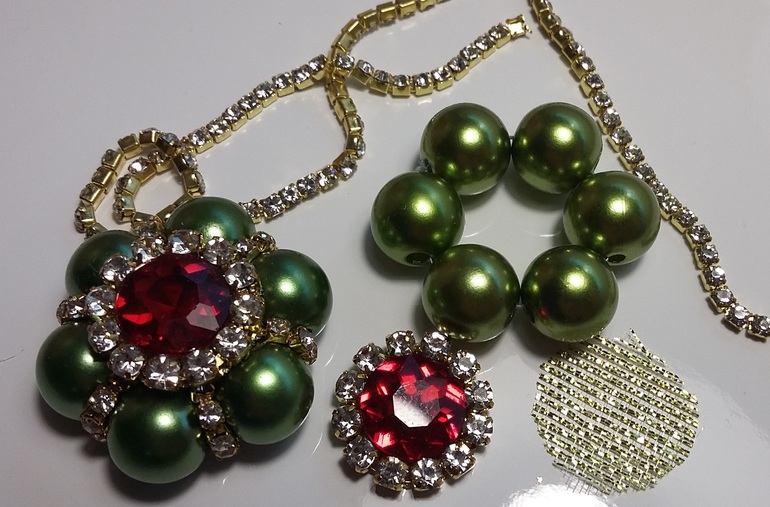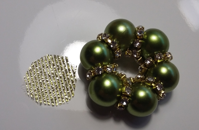 Все что нужно это бусинки на нитке размер 10 мм в кол-ве 6 шт, стразовая лента размер SS6, стразинка 10 мм обрамленная страз. лентой SS12, кружочек из парчи для основания и конечно же клеевой пистолет.