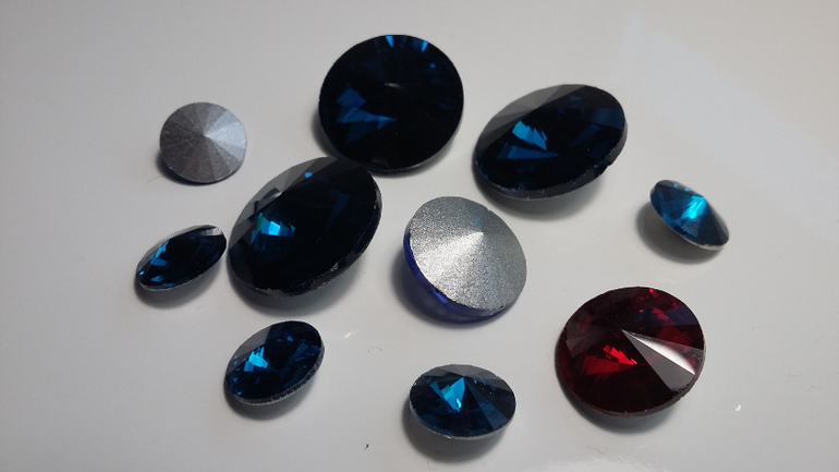 тут очень хороши видна разница в самих стразинках: голубая с неровным дном и более глубокая по цвету, а вот прозрачная стразинка с плоскми дном и не такая глубокая по цвету, а малость мутная. Кстати, тут бусины 8 мм в кол-ве 7 шт; на голубой стразинка 10 мм + лента SS12, на бежевой стразинка 10 мм + лента SS6