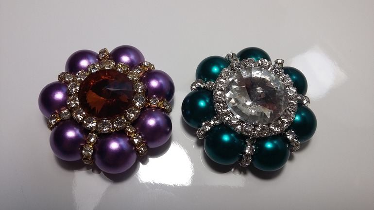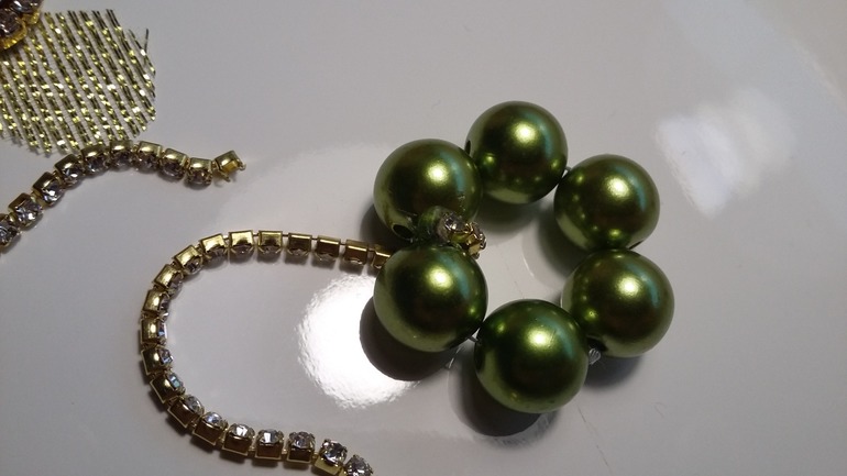 тут крупные серединки. бусины 10 мм в кол-ве 7 шт. На фиолетовой стразинка 12 мм + страз лента SS12. на изумрудной стразинка 14 мм+ страз лента SS12.