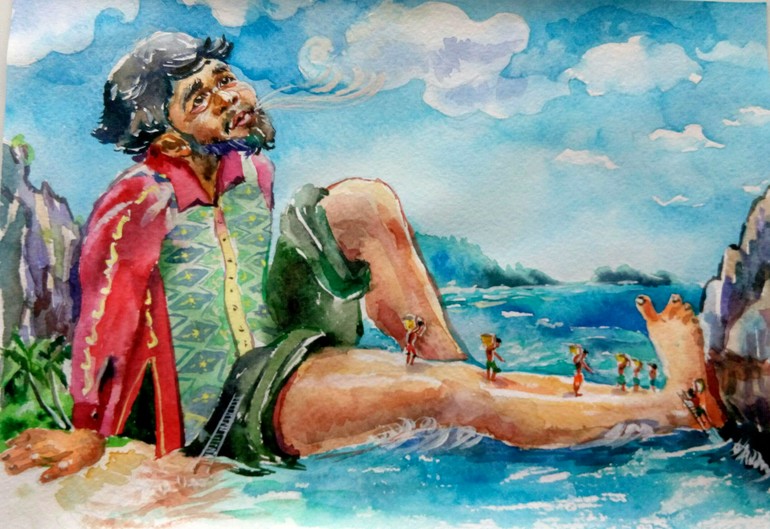 Вот уже и самая середина моря. И тут Ангало укусил муравей. Вздрогнул великан от боли, а люди с соляными корзинами попадали в море.