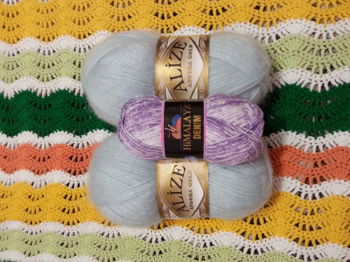2 мотка ALIZE ANGORA GOLD 80% акрил, 10 мохер, 10 шерсть 550м в 100гр. и моток 100% хлопка интересного окраса HIMALAYA DENIM 50 гр 140 м (мотка с запасом хватает на простую детскую шапку).
