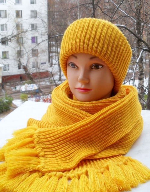 Объемный шарф с кистями, одет в два оборота. Я бы сделала лучше со снудоми-но заказали с шарфом) Комплект связан из полушерсти.
