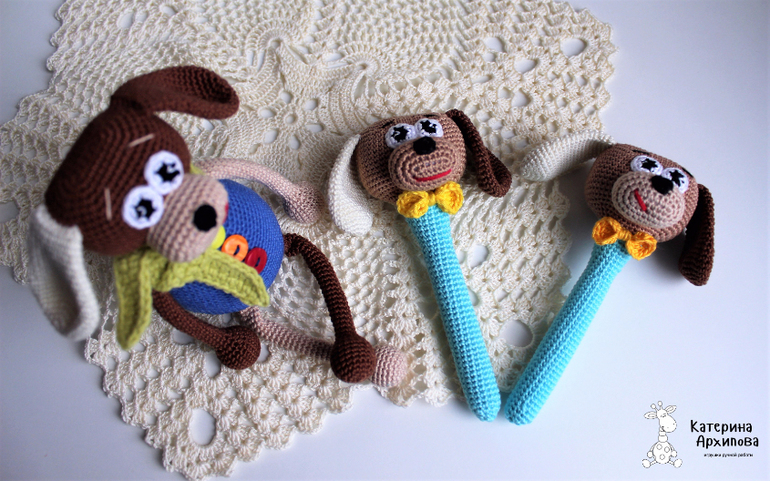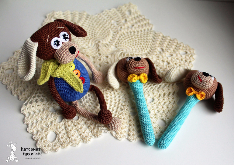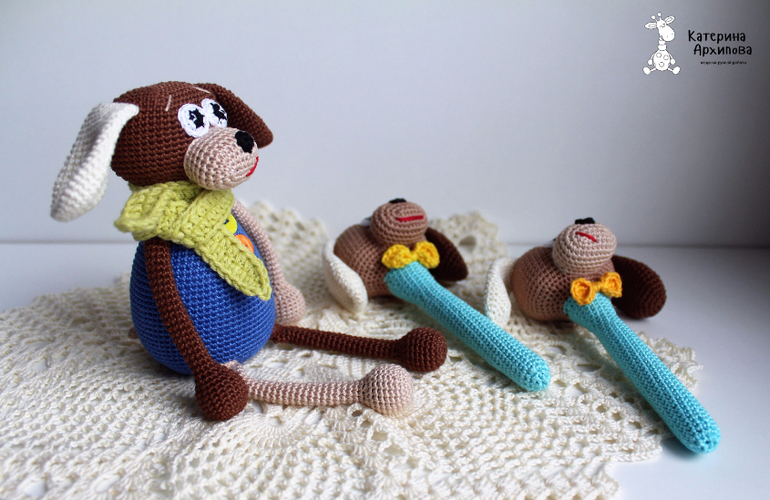 Катюш, заглянула к тебе в пост и улыбнулась))) Чудесные весёлые девочки-подружки)) Мишка с синим носом и бровками такой очаровательный))) Увидела нового собакина, думаю это не первый и не последний, ведь скоро НГ - год собаки)) погремушки-развлекушки милые штучки)))