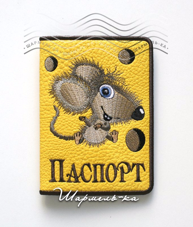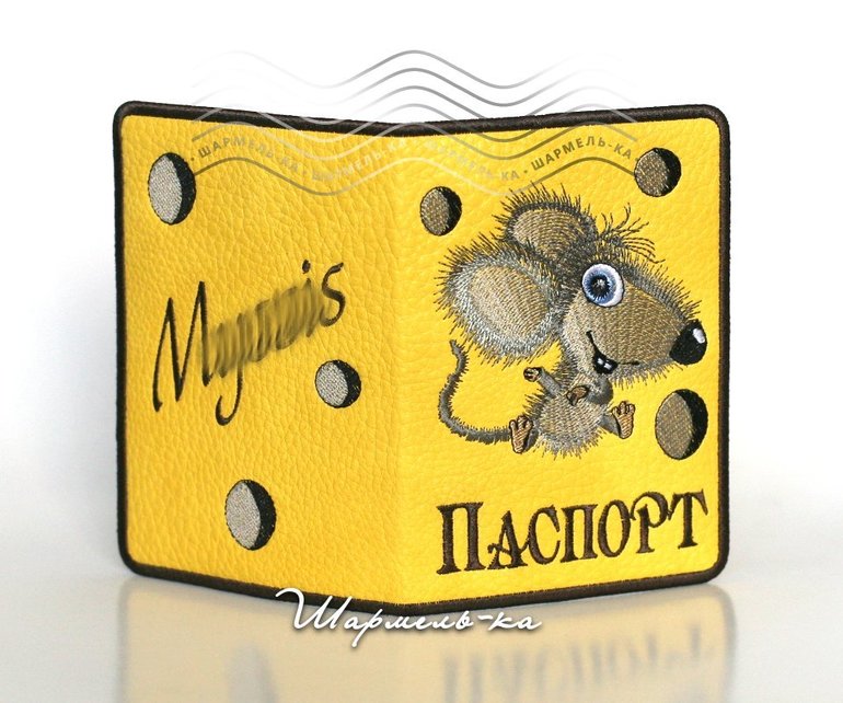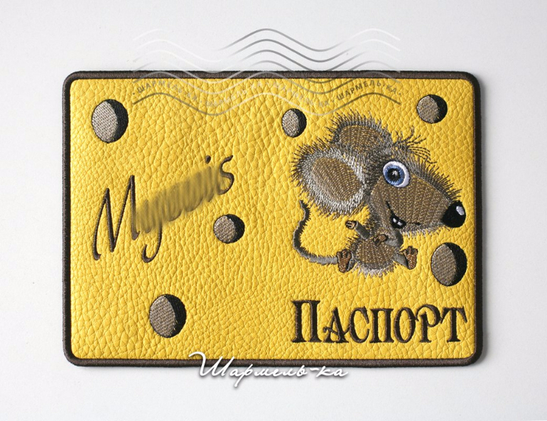 Яркая позитивная вышитая обложка для паспорта "Мышка в сыре" с очаровательным мышонком на фоне куска вкууусного дырчатого сыра :))), вышито на фактурной экокоже.