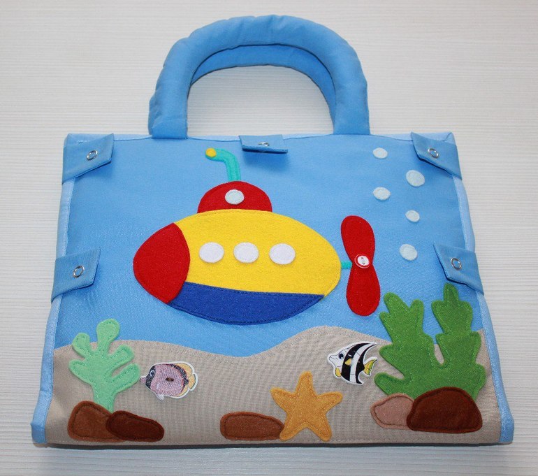 Сумка-планшет магнитная рыбалка состоит из большого игрового поля, двух магнитных удочек и 16 морских обитателей, выполненных из фетра. За счет двух магнитных удочек играть могут сразу два малыша. Большое игровое поле выполнено в виде волн -кармашков в которых могут прятаться много различных рыбок. Кармашки-волны выполнены таким образом, чтобы у каждого малыша было свое индивидуальное игровое поле.