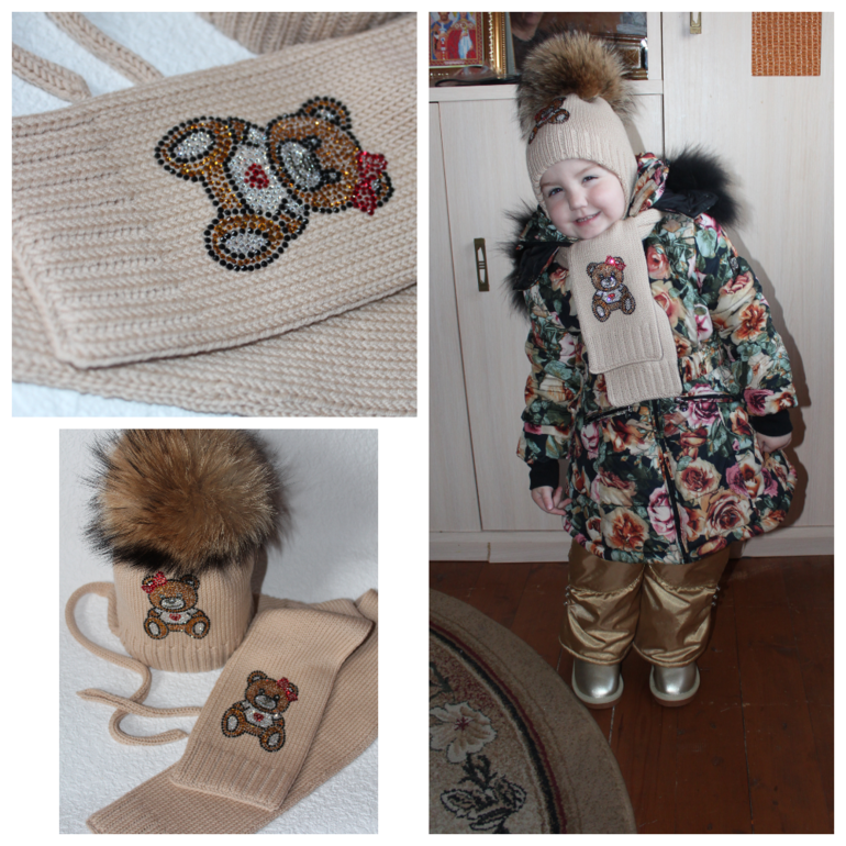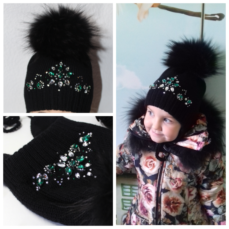 1.Шапочка двойная из Итальянской пряжи Лано Гатто Супер Софт, 100 % меринос. Помпоны кролик рекс. Украшение связано руками и украшено стразами.