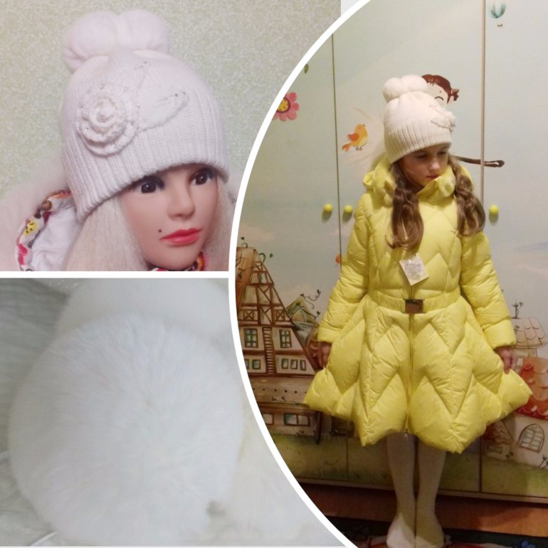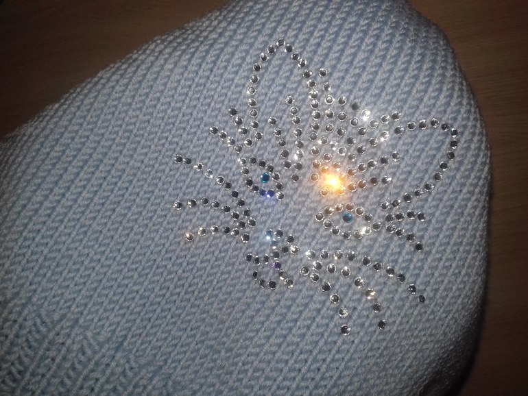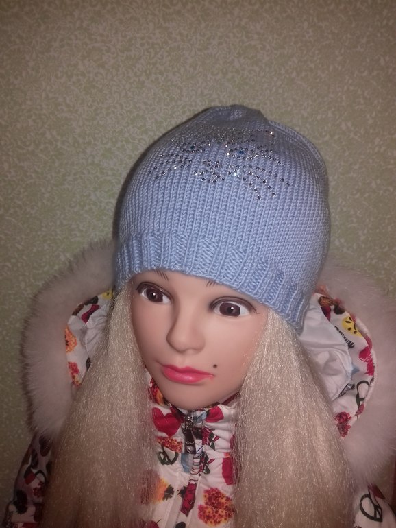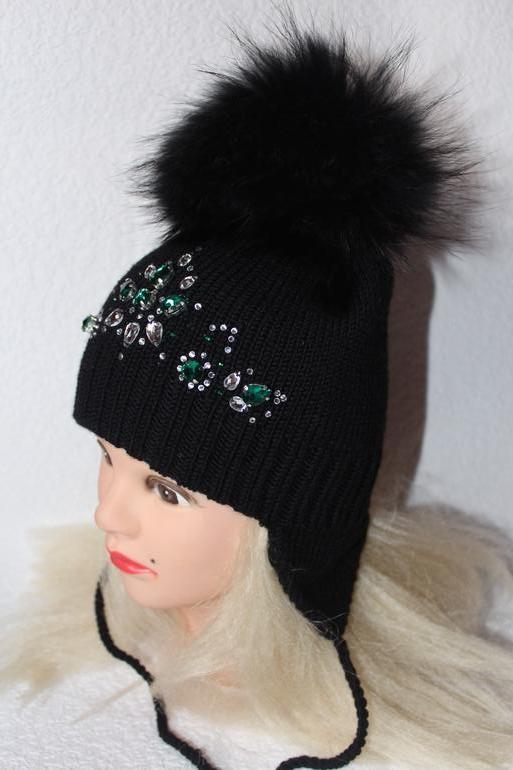2. Шапочка в два слоя из Итальянской пряжи Лано Гатто Супер Софт, 100 % меринос. Помпон песец. Украшена камушками и стразами...