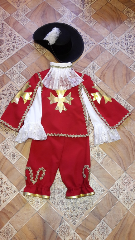 Добрый день всем! Мой новый костюмчик. Мушкетёр на рост 116см. Какое же всё таки выигрышное сочетание - красного, белого, золото и немного черного))).