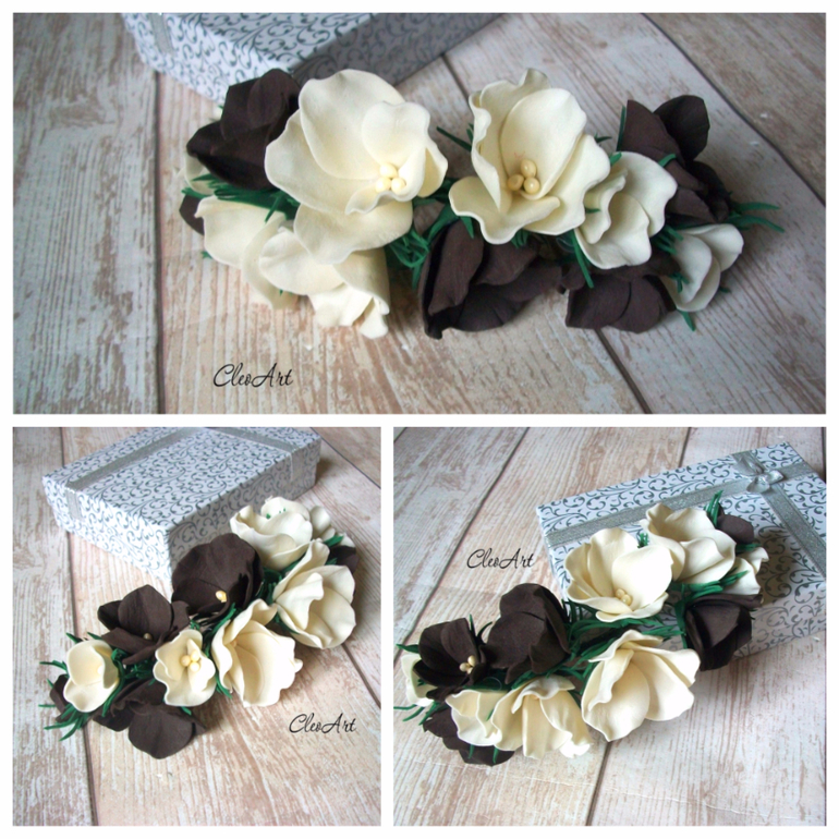 Цветы из ткани и форма. Канзаши. Украшения для волос.Украшение для прически в виде веточки с цветами нежного сливочного и насыщенного шоколадного оттенков станет прекрасным дополнением к элегантному и романтичному образу.