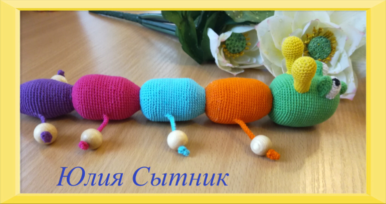 Гусеница выполнена из хлопковых ниточек, бусины буковые, наполнитель холлофайбер. Размер 28 см.