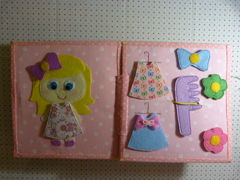 Разворот № 1. Куколка пришита, вся одежда и бантики - заколочки на липучке, можно менять местами.