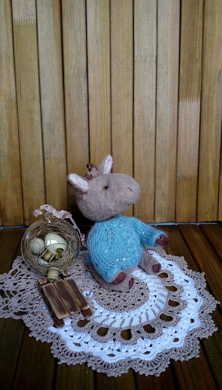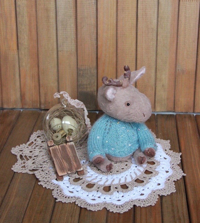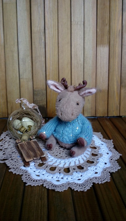 Лось 13 см. сидя, голова на двойном шплинте, очень подвижная получилась. Лосик стоит только с опорой, больше любит сидеть.