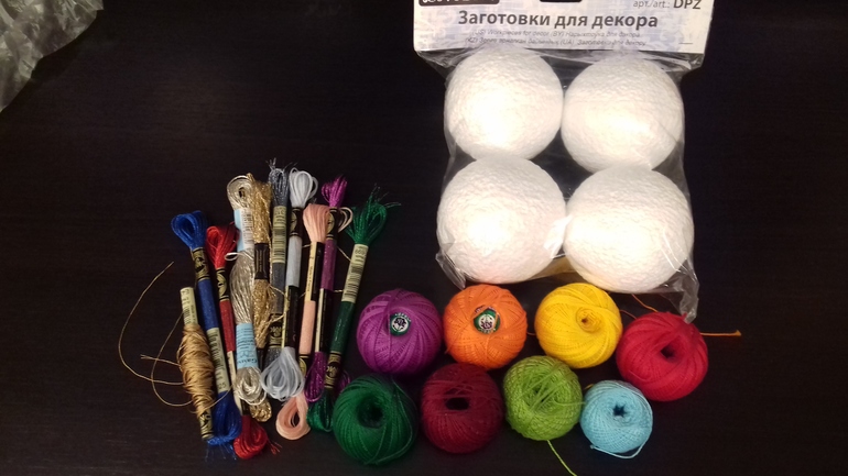 Я решила до выходных отложить снеговичка. Тут приспичило подарочек смастерить, решила вспомнить свои шары темари. Когда то делала, все раздарила. Вот вспомню былое. Сдклаю шары на елку. Раньше основу сама делала, по традиционному описанию темари (из капроновых чулков :-))), теперь решила на готовой основе попробовать. Купила шары, а ниточки (металлизированное мулине и ирис) достала из запасов. Пока фото материалов. К следующему отчету постараюсь процесс пофоткать.