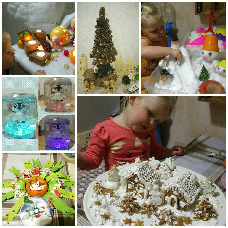 Подсвечники вырезали из апельсинов и грейпфрута. Сами делали "шарик" с блёстками. Веночек из бумаги. Ёлка из шишек. Снежная сенсорная коробка. И пряничная деревушка.