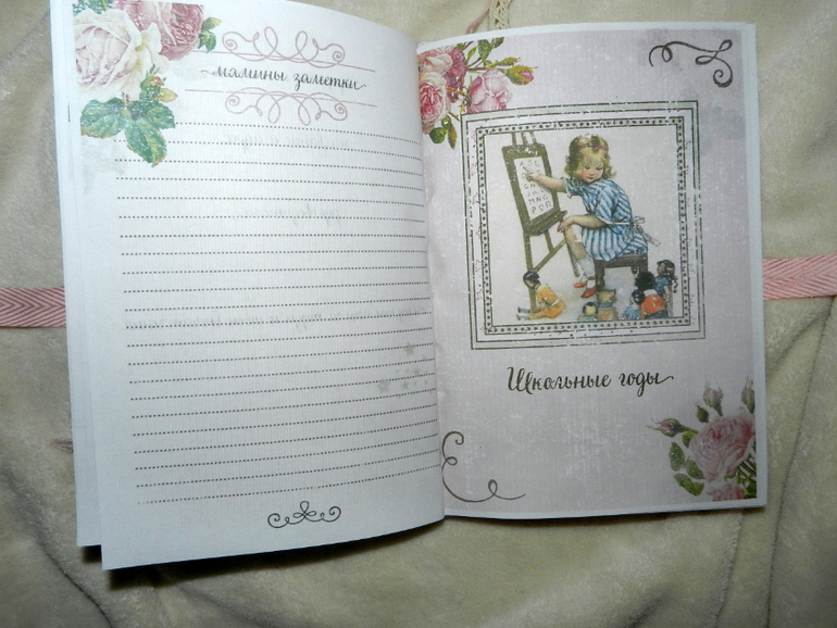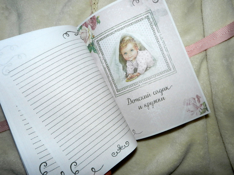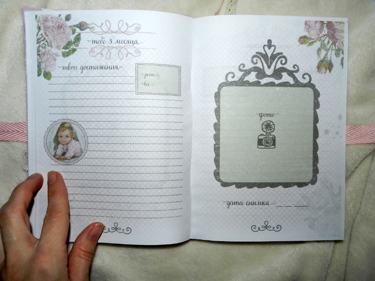 Ооооочень вместительная книжечка для хранения самых важных и нежных воспоминаний!. От момента беременности до 7 лет крохи. Множество различных разделов, каждый месяц первого года жизни и каждый год от года до семи. Графики веса, роста. роста зубок, достижений. Конвертики для писем, рисуночков. 2 закладочки. Можно разместить снимки УЗИ и около 30 фото.