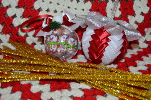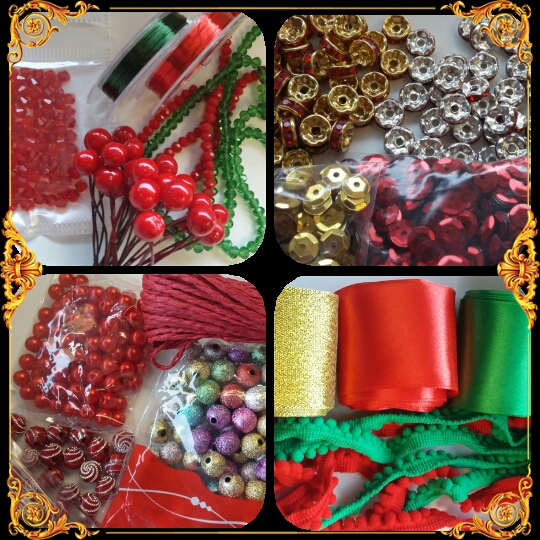 Слоник в Новогодних оттенках: зеленая и красная темьма с помпошками по 2 м., зеленая и красная атласная лента 50 мм по 5 ярдов, парча 50 мм 5 ярдов, красный бумажный шнур, пайетки 3-х цветов, красная и зеленая проволока 0.3 мм, золотистые и серебряные разделители по 50 шт. (очень легкие), ягодки на проволоке 24 шт., акрил бусины 3-х видов и стекл.граненные бусины 3-х видов 4 мм кажется по 100 или 150 шт.