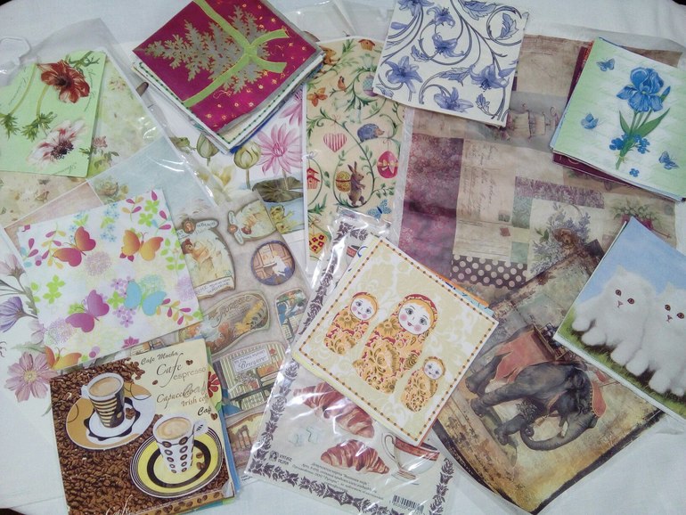 В состав слоника входит шесть разных декупажных карт, две рисовые карты и много-много салфеток для декупажа.
