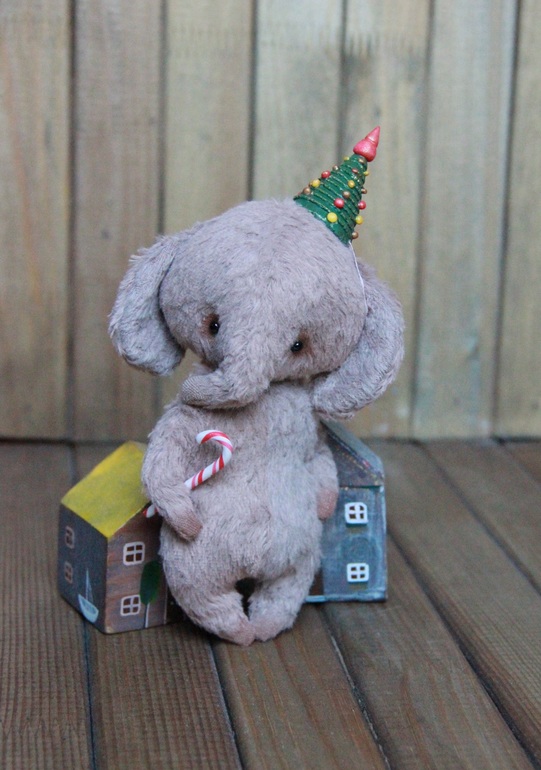 Слоник тедди-примитив размером в ладошку. Ростиком 13 см (без учета елочки), с леденцом в лапке. Крутится только голова. Набит опилками, утяжелен, ароматизирован сухоцветом лаванды - очень приятно пахнет))
