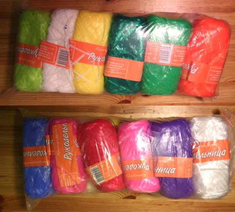 Рукодельница - 100% полипропилен, 12 разных моточков. Подходит для вязания мочалок, пляжных сумок, шкатулок, а так же весёлых и ярких игрушек для ванной.