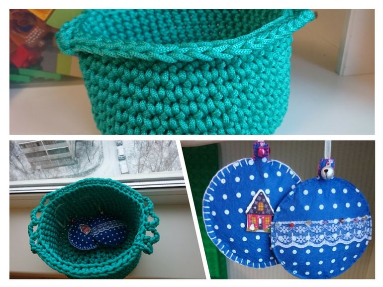 Вязаная корзинка для хранения елочных игрушек и не только) и два фетровых шарика. И, обязательно будет сладкий подарок! Который мы обсудим с победительницей) на выбор: 1) варенье домашнее, 2)мед домашний, 3)конфетки деткам))