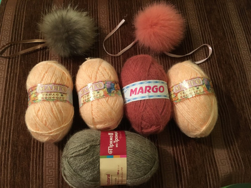Три моточка светло персикового цвета шерсть/акрил, один пыльная роза шерсть/акрил и один моточек 100% шерсть на носочки. И два помпона натуральных