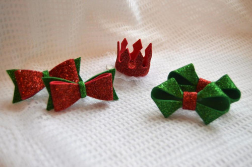 7 Елочных двусторонних игрушек из фетра, роза из атласных лент на резинке, букет из атласных лент на длинном зажиме.