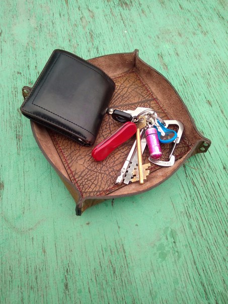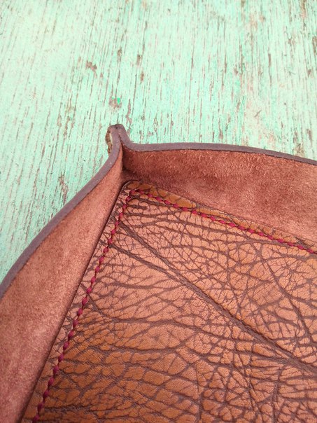Всем доброго вечера🌹 Я с необычной новинкой: кожаной тарелкой-подставкой, выполненной из коричневой фактурной кожи с глубокими черными царапинами. Углы соединены двусторонними хольнитенами. На дне тарелки уложен кожаный квадрат, прошитый вощеными нитками бордового цвета.