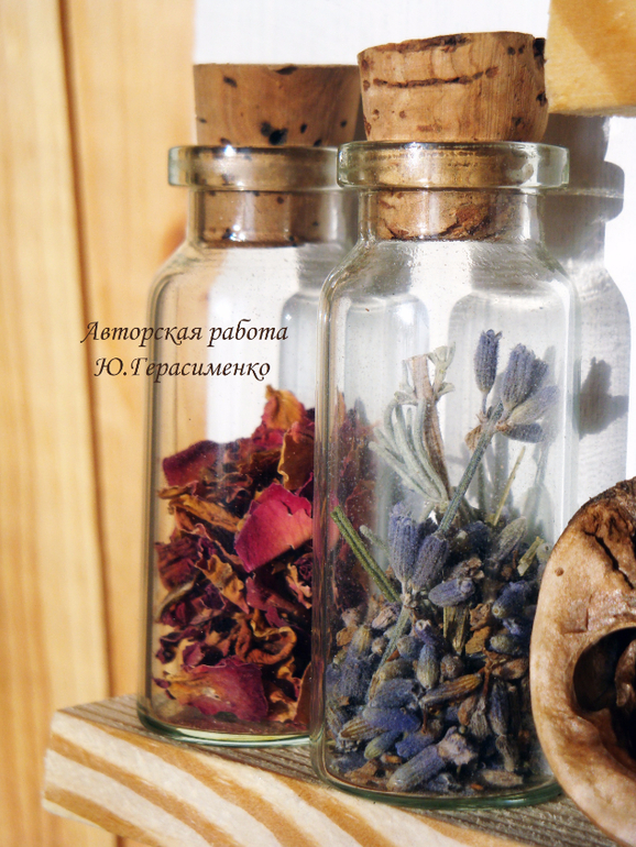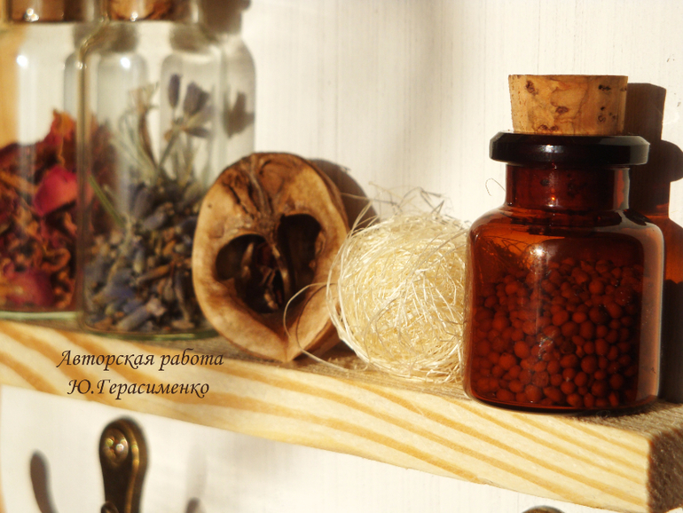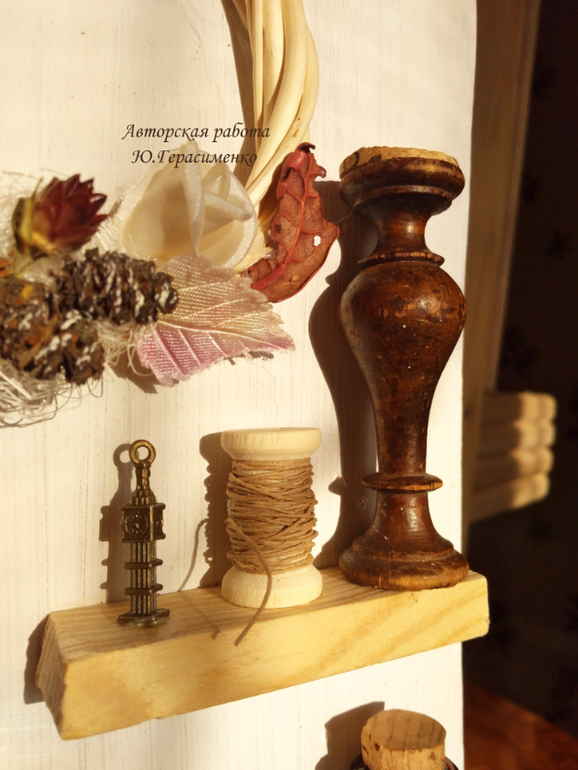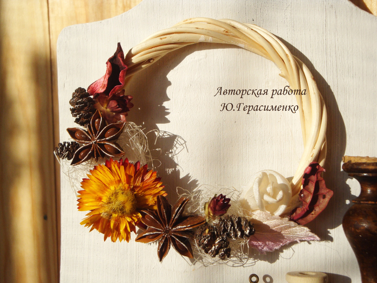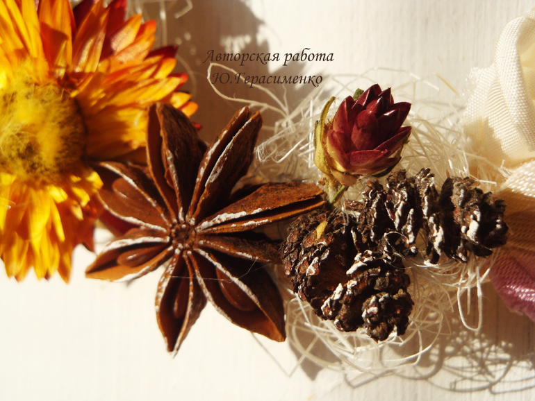 В работе использованы сухоцветы бессмертника, лаванды, крымской розы, декоративных растений, скорлупа ореха, шишки ольхи, звездочки бадьяна, зерна горчицы. Так же использованы лоза, сизаль, декоративные пузырьки, фурнитура, винтажный декор. Доска покрыта нетоксичной акриловой краской.