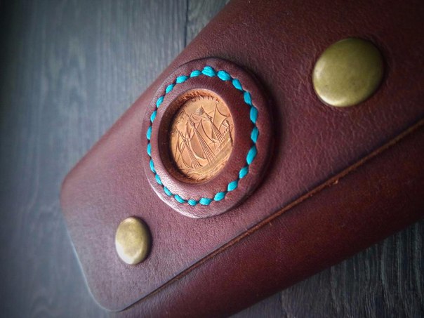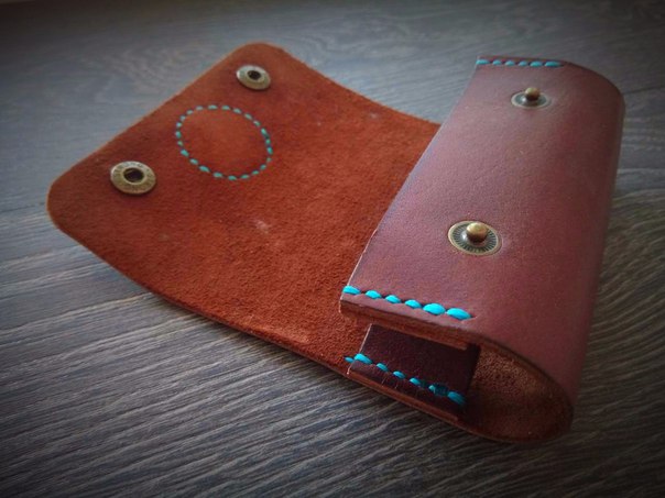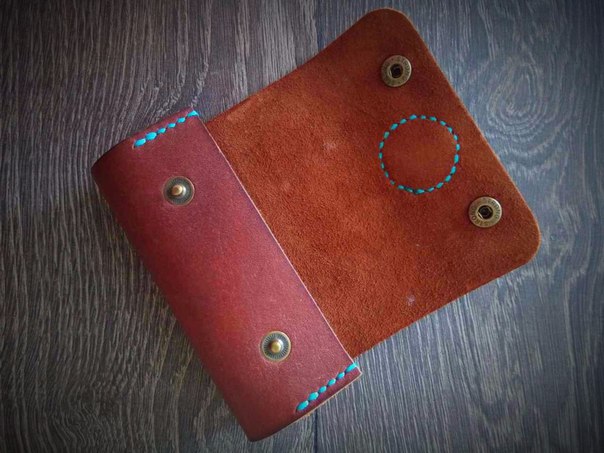 Всем рукодельницам доброго вечера🌹 Хочу показать одну из последних работ мужа: кожаная визитница. Или кардхолдер - кому как больше нравится) Кожа - коричневый краст, затертый воском. Нити синие вощеные. Все швы выполнены вручную. 💪 Хотя в сравнении с сумкой-их там всего ничего) Закрывается на две металлических кнопки,выполненные под старину.