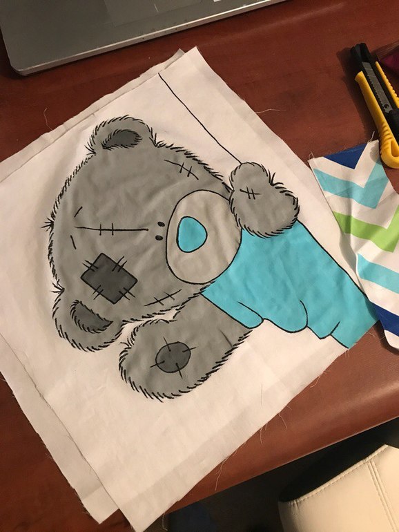А вот еще один милый мишка, из которого скоро будет комплект бортиков и также отдельно декоративная подушка для Мишутки. Рисунок этот уже нарисован в ручную специальными красками для ткани, на фото еще сохнет)