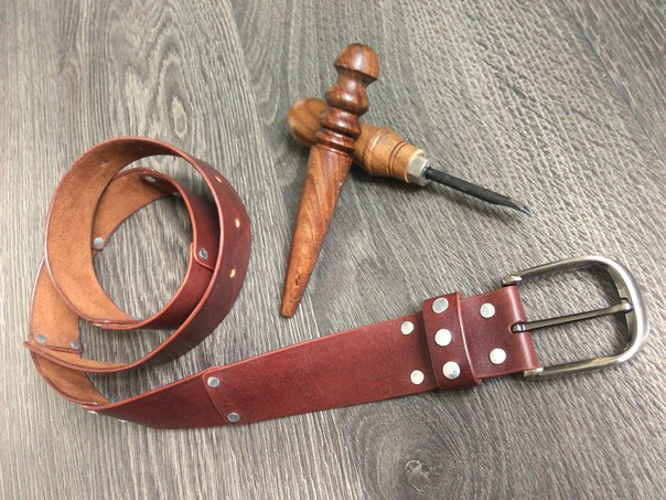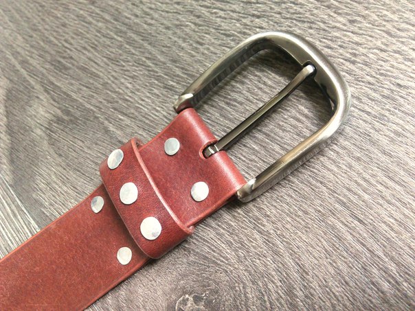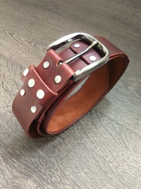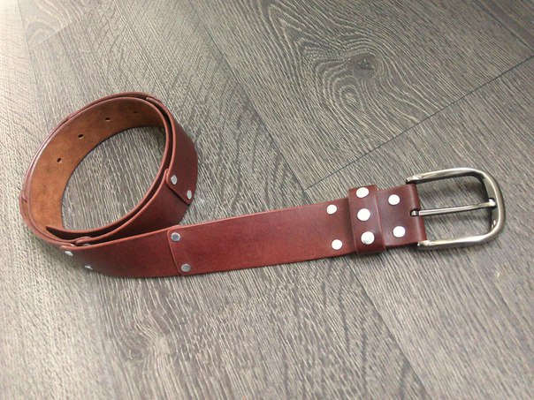 Ремень состоит из сегментов, скрепленных между собой заклепками, расклепанными настоящим молотком. Ремень обработан смесью воска и льняного масла для повышения износостойкости. Торцы прокрашены и отполированы. Отлично сочетается с джинсами.