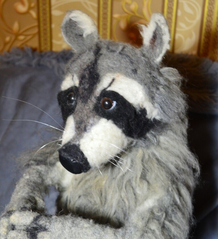 Фелтинг (валяние шерсти)Сваляла наконец-то енота) Не могла дойти до финиша больше, чем полгода. Енот 45 см в высоту. Натуральная шерсть кардочес + гребенная для меха, носик из кожи, пластиковые глаза, усы из лески)
