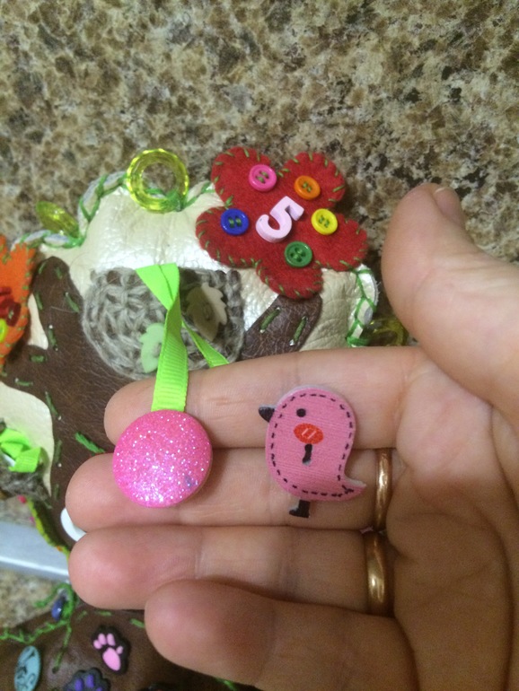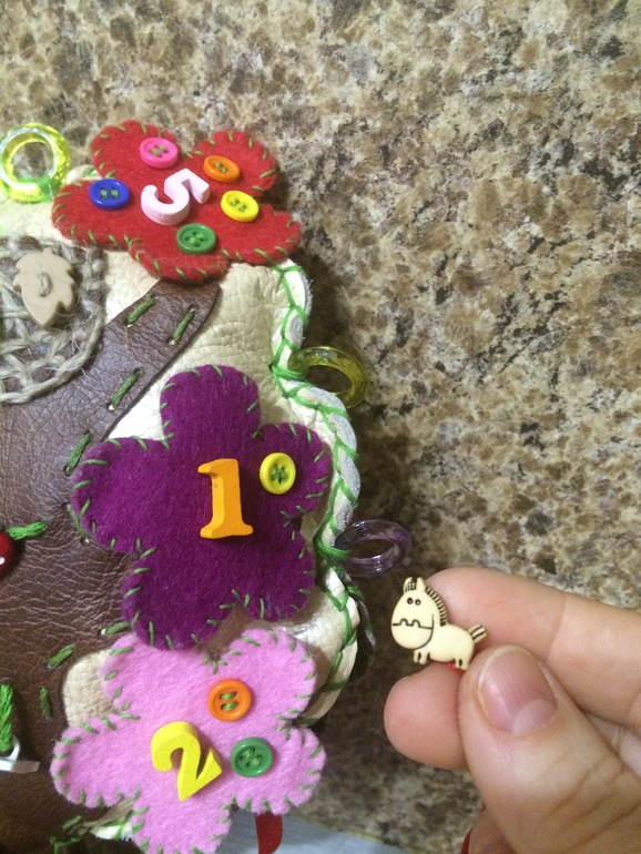 спасибо Настя за такую чудесную идею. Во первых я шила в месте с сыном. Марк командовал что куда пришивать. Выбирал нужные пуговки комментировал процесс. В общем активно участвовал в создании игрушки. На этой стороне можно посчитать листочки. Поучить на пуговках размер большая, маленькая, средняя. Конечно же цифры