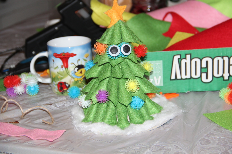 Поделки с детками.Сделала елочку в садик из фетра, на клеевой пистолет клеила. Доча крутилась рядом, играла фетром и развешивала шары.