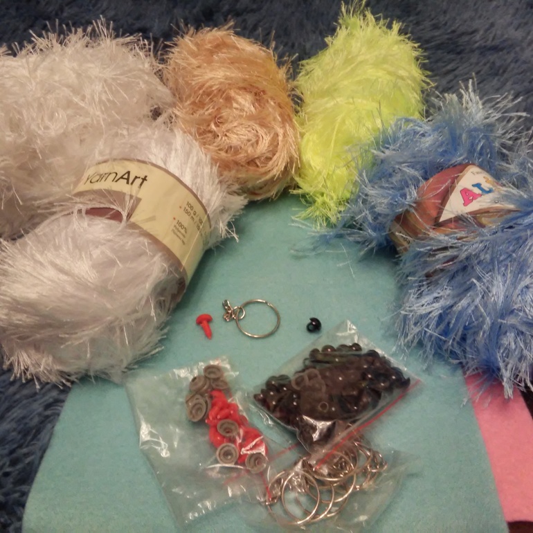 3 листа фетра 20х30 см; пряжа травка - 2 новых мотка и 3 чуть начатых; носики для игрушек (около десятка), глазки на ножке (много), десяток колец для брелков и обязательно - сладкий посленовогодний сюрприз.